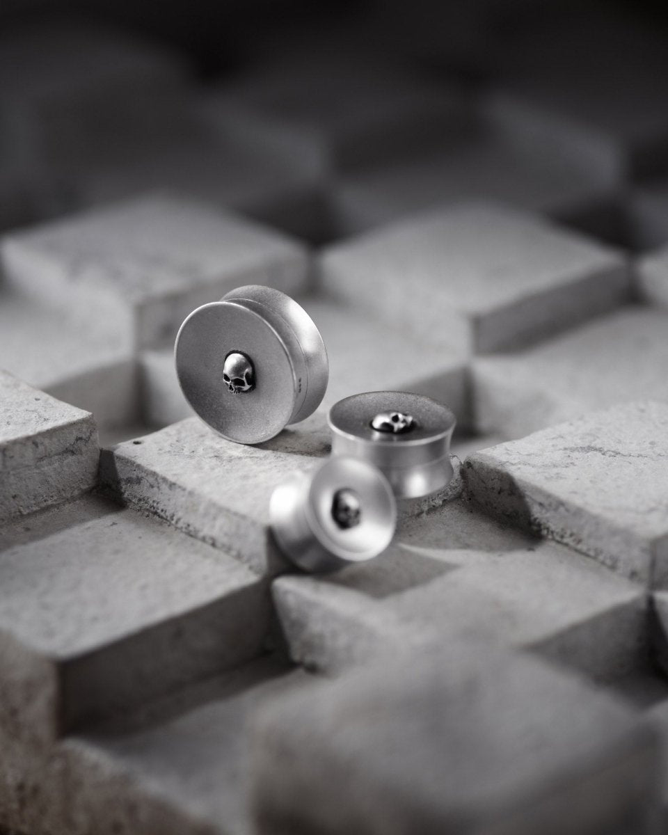 Embrace punk defiance with our reversible skull plugs. One side flaunts a bold human cranium, the other offers a sleek plain surface. Choose your daily rebellion.